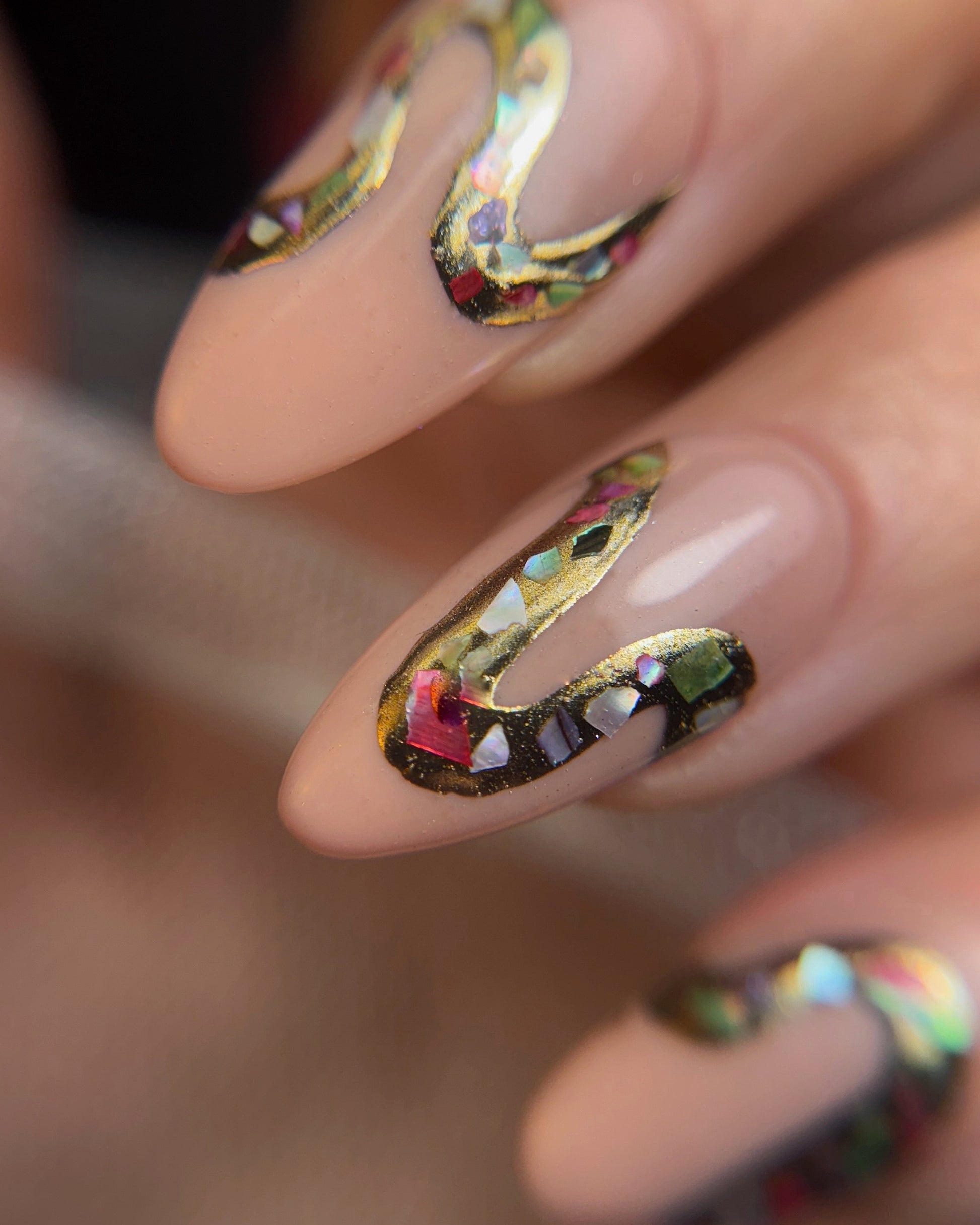 - Using a liner brush fill in any gaps between the shell pieces and the surface of the nail, this can be done with top gel, hard gel or clear gel,