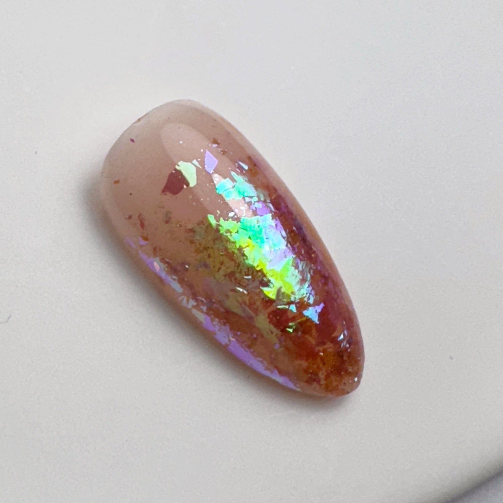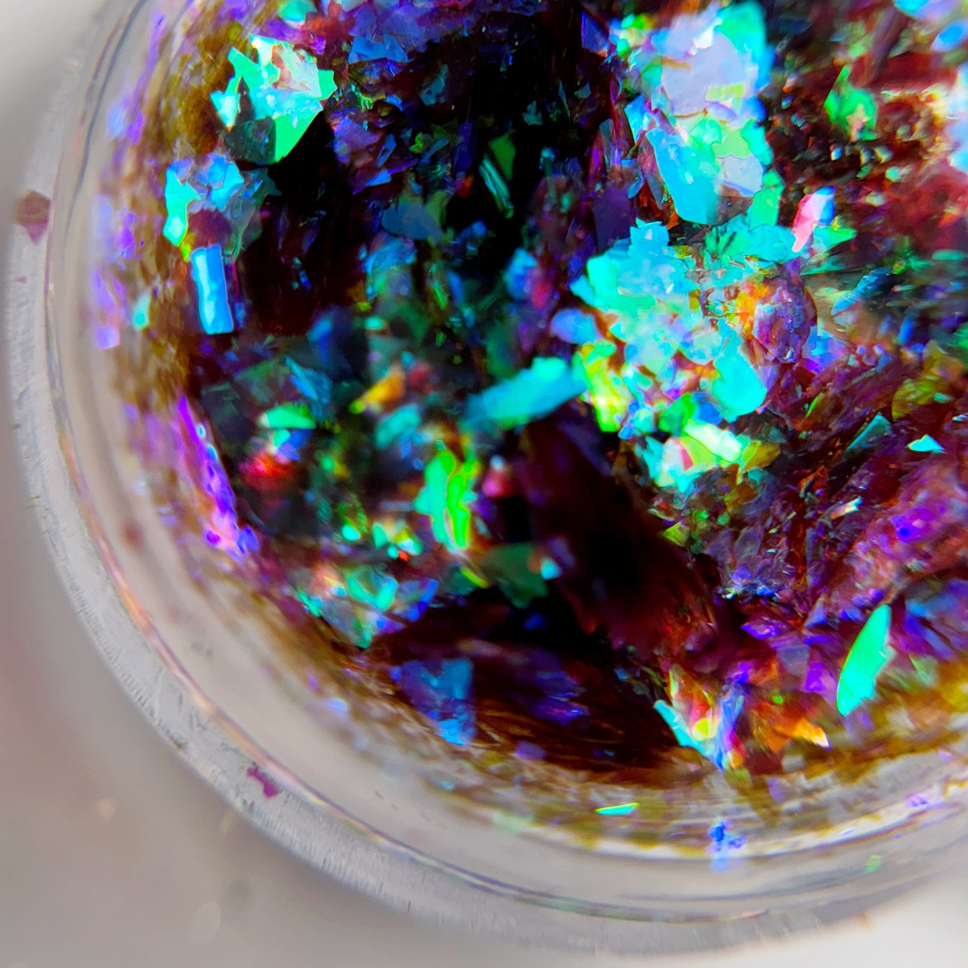 - Leave sticky layer intact (if it’s not sticky enough try adding a thin layer of foil gel, tacky primer, or base gel) and gently flakes into it, be careful to not touch uncured product with your bare hands.